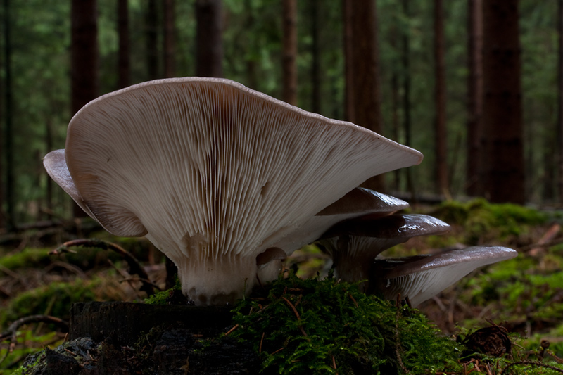 Ganz in der Nähe fand ich auf einem Fichtenstubben diese Gruppe Pleurotus ostreatus. Bisher habe ich sie nur auf Buchen und Schwarzem Hollunder gefunden.