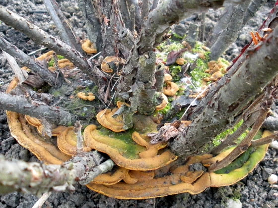 Hallo und allen hier ein gutes neues Jahr! Als fast ausschließlich Mitlesender möchte ich die pilzliche Sauregurkenzeit nützen und mal eine Anfrage posten. Die Sache ist zwar wahrscheinlich banal, aber ich möchte endlich etwas über einen seit langem in meinem Garten lebenden Pilz erfahren. Der Pilz, der für mich wie ein Baumpilz aussieht (Laienmeinung), lebt und gedeiht seit mehr als zehn Jahren an (in?, mit?) einem Ribiselstrauch (Weiße Johannisbeere) ohne dass der Strauch bisher einen Schaden genommen hat (sind denn Pilze wie dieser nicht alle Schmarotzer?), im Gegenteil, der Strauch erfreut mich Jahr für Jahr mit zahlreichen, köstlichen Früchten. Kann es sein, dass es sich um einen baumpilzähnlichen aber symbiontischen Pilz handelt oder ist es eh ein schmarotzender, der den Strauch nur geringfügig, also kaum merkbar schädigt?