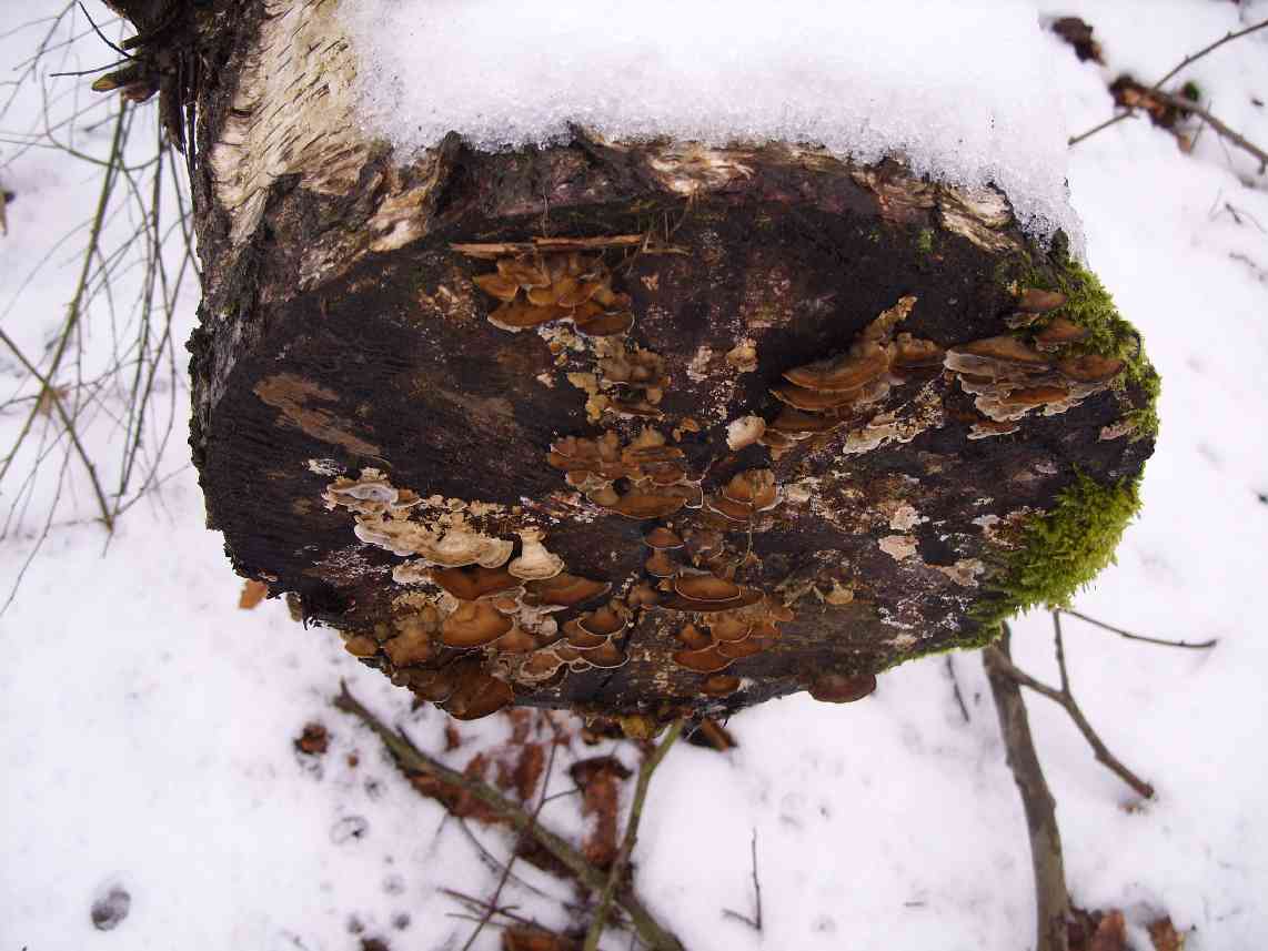 Hallo Leute, nachdem ich bei meinem letzten Vortrag: Pilze gibt's das ganze Jahr!" feststellen musste, dass ich nur ganz wenige Fotos hatte, die auch mal ein bisschen Schnee zeigen, bin ich angesichts des einsetzenden Tauwetters seit langem mal wieder in den Wald gegangen. Außer einigen gewöhnlichen Porlingen habe ich eigentlich nur vier weitere Arten gefunden: Bjerkandera adusta, den angebrannten Rauchporling, in mehreren Vorkommen (s. Foto), ebenso Panellus Stipticus, den Herben Zwergknäuelingalte Sarcomyxa serotina, Gelbstielige Muschelseitlinge, und, tausenderweise an jedem Eichen-Totholz, Stereum gausapatum, den Striegeligen Schichtpilz. Bis auf die Muschelseitlinge waren alle frisch gekommen. In der Nachbarschaft konnte ich feststellen, dass die Tiegel-Teuerlinge, Crucibulum laeve, als fünfte Art, ihr schon im Spätherbst begonnenes Wachstum unverdrossen unter Eis und Schnee fortgesetzt haben. Bis demnächst, Peter!