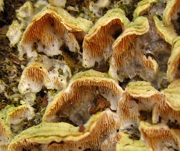 : Steccherinum kann ja laut Literatur selten auch an Nadelholz wachsen. : VG Ingo W Lieber Ingo, ich war gestern in Eile, sorry - und ich hab den letzten Satz deines Rätsel-Postings nicht gelesen - ich wollte dir dein Rätsel natürlich nicht kaputt machen. Auch dafür sorry. Also hier noch ein weiteres Foto von meinem Pilz. Ich hab Steccherinum ochraceum (und übrigens auch robustius)letztes Jahr gefunden. Mir sah das wirklich anders aus. Wenn du allerdings auch nach diesem Foto noch dahin tendierst, geh ich am Wochenende nochmal dorthin und hol mir noch was. Und versuch, das mikroskopisch zu klären. Zumindest die Sporen sehen ja sehr unterschiedlich aus. Ich hatte allerdings danach gesucht und keine gefunden. Aber dann werd ich mir mehr Mühe geben. Die Skelettzystiden hab ich wirklich in großer Menge gefunden, allerdings finde ich, dass die abgebildete anders aussieht als in Pilze der Schweiz.