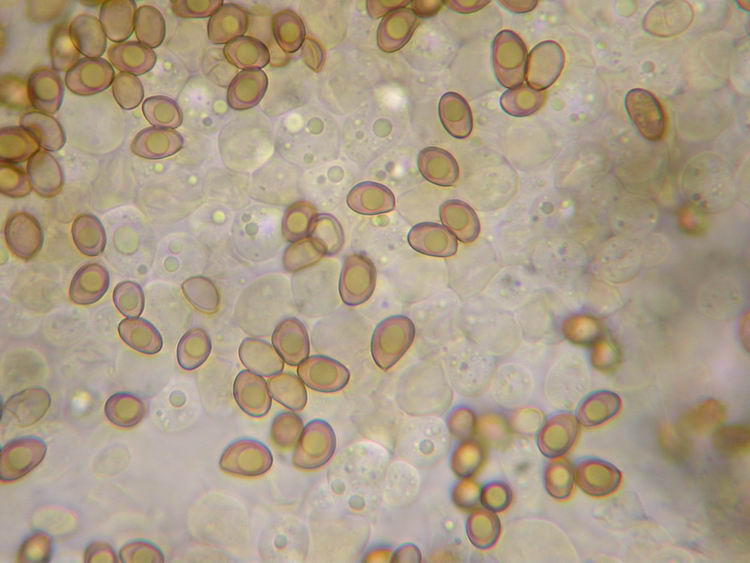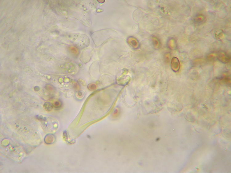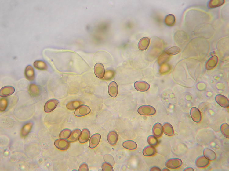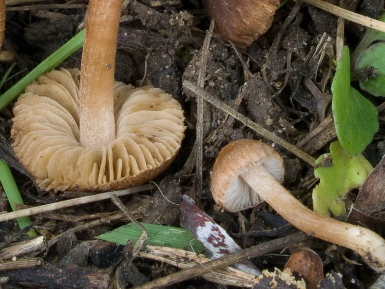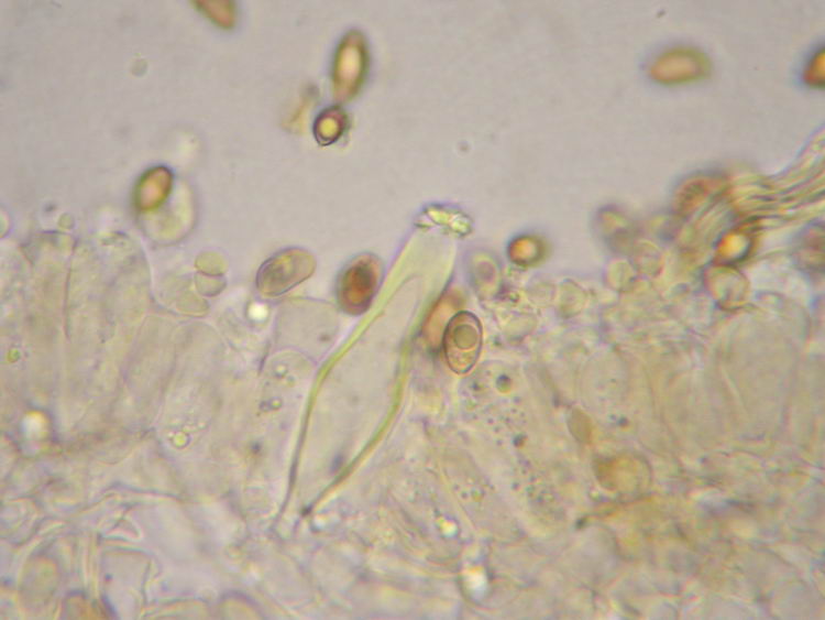 Funddaten: 04.07.2009; MTB 7735-4-3-2, 490 m; München, Fröttmaninger Heide, Magerwiese auf Kalkschotter, beweidet (Schafe, Ziegen), auf Erde bei Salix spec. und Salweide, gesellig (>10 Fk); Hut: bis 2,2 cm breit, jung stumpfkegelig, später gewölbt mit stumpfem Buckel, fein befasert, auch ein wenig filzig, zum Rand hin etwas gröber, aber kaum aufreißend, dunkelbraun bis dattelbraun, am Rand kaum heller; Stiel: bis 4 x 0,4 cm, zylindrisch, basal schwach verdickt, an der Spitze satt cremefarben, stielabwärts gelbbraun bis haselnussbraun, bis über die Mitte feinst bereift, zur Basis hin Bereifung undeutlich, mehr faserig werdend; Lamellen: aufsteigend und abgerundet schmal angewachsen, bauchig,jung grauweiß, später graubraun und zuletzt olivocker; Schneiden konvex, weißflockig; Fleisch: im Hutkern weiß, sonst wässerig grau, im Stiel schmutzig cremefarben; Geruch: schwach spermatisch; Cheilozystiden: sehr variabel, sublageniform (Hälse nie ausgeprägt lang) bis fusiform, oft auch keulig, metuloid, aber oft ohne Kristalle, dickwandig, in KOH blass gelblich, Maße: ca. 40-60 x 12-17, Wandstärke am Bauch um 1 µm, am Hals 2-2,5; Pleurozystiden: sublageniform bis fusiform (wie die Cheilos), Maße ca. 48-60 x 11-16, Wandstärke am Bauch um 1 µm, am Hals 2-2,5; Stielbekleidung: Echte Kaulozystiden auch unterhalb der Stielmitte vorhanden, variabel geformt (lageniform, breit fusoid, keulig), metuloid, im unteren Stielbereich z.B. 38x14, 53x15, 42x15, im oberen Stielbereich z.B. 54x14, 60x19, Wandstärke ca. 1-1,5; Basidien: überwiegend 4-sporig, z.B. 29x8, 33x10; Sporen: ellipsoid bis subamygdaloid, Apex zumeist deutlich rundlich, glatt, Maße 8,5 x 5,3 (7,5-10 x 4,5-6,5), Q=1,60 (1,42-1,89), 20 Sp. gemessen;