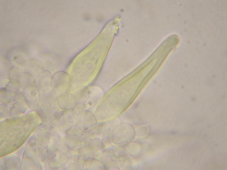 hier noch ein Foto von Hymenialzystiden, die zu den bräunlichen Kollektionen gehören: schlank, dickwandig und in KOH ziemlich gelblich, ganz im Gegensatz zu den grauvelierten Teilen. Echt spannend! Leider habe ich noch viel zu wenig Kollektionen, aber zumindest ansatzweise könnte ich mir vorstellen, dass sowohl die grauvelierten, also auch die fast weißen, ziemlich grob schuppigen, etwas eigenes sind. Helmut, hast du nicht eine Sammlung von Originalbeschreibungen? Sowas täte hier echt not! Beste Grüße