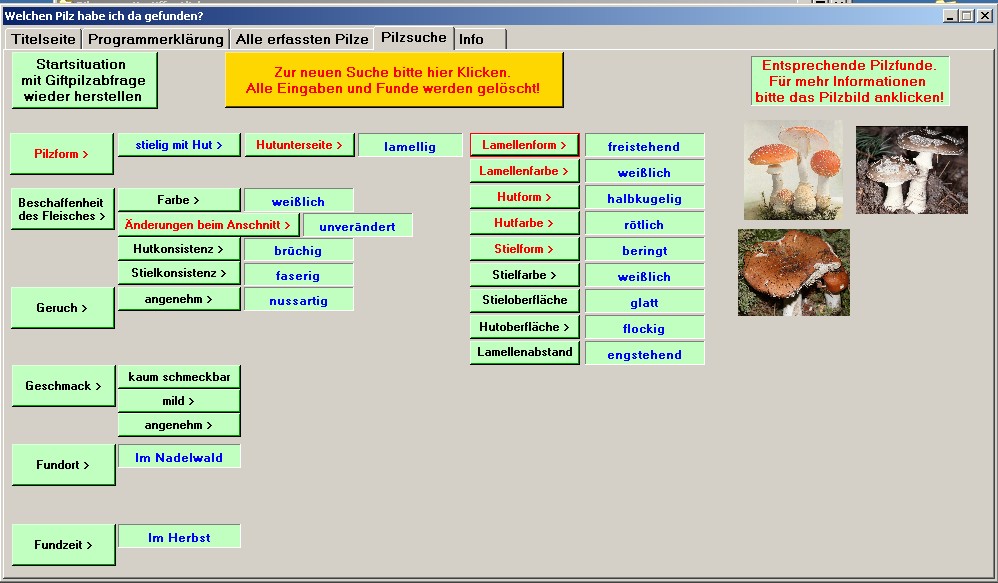 Nun habe ich mich (als ehemaliger Informatiklehrer an der Berufsschule) hingesetzt und habe, zuerst mal für mich selbst ein Pilzerkennungprogramm geschrieben, bei dem man typische Merkmale (max. 19, mind. 10) anklickt und sehr schnell einige in Frage kommenden Pilze angezeigt bekommt. Um es genauer zu erfahren klickt man eines der erschienenen Bilder an und bekommt exaktere Erkennungshinweise als auch Literaturverweise.