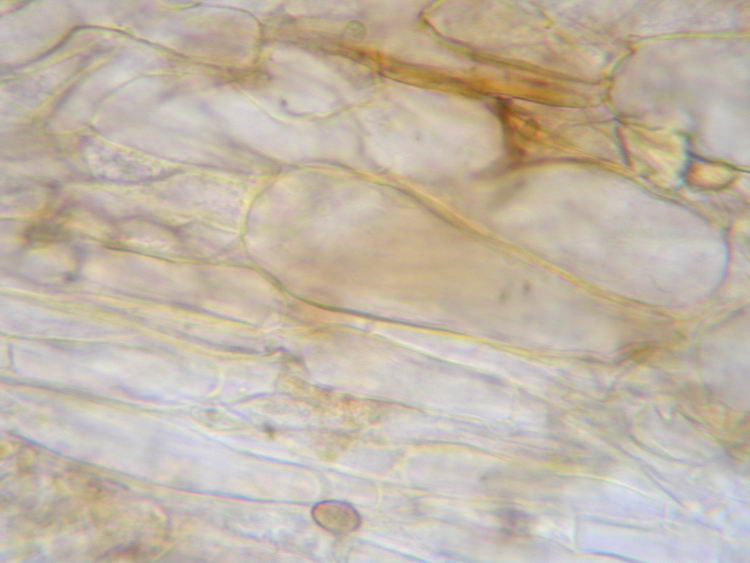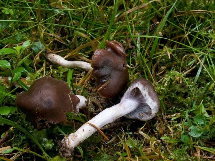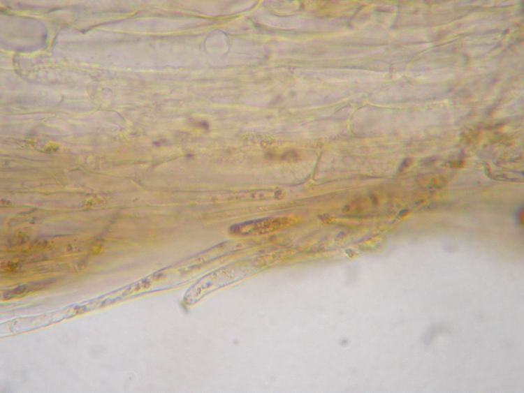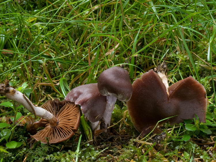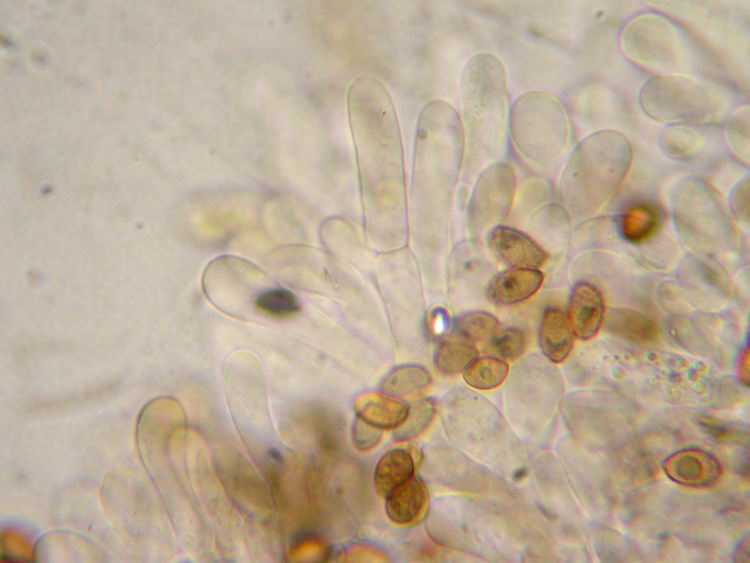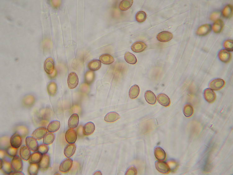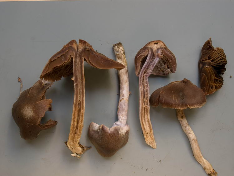 Funddaten: 29.08.2009; MTB 8135-4-2-1, 690 m; Kleinhartpenning, Hackensee, im eher sauren Fichten-Tannen-Wald, bei Fichte und Tanne an einem Erdpfad; gesellig (4 Fk); Hut: bis 5 cm breit, jung kegelig, später flach gewölbt mit schwach ausgeprägtem Buckel, Oberläche fein befasert, schokobraun, jung am Hutrand mit grauweißen faserigen Velumresten und auch am Scheitel mit graulichen Velumspuren, später komplett verkahlend, hygrophan, vom Hutrand her streifig ausblassend; Stiel: bis 6,5 x 0,7 cm, zylindrisch, hohl, basal gleichdick, schmutzig weiß und stark längsfaserig, stellenweise schmutzig blassbraun verfärbt, an der Spitze deutlich lila; Lamellen: : aufsteigend und breit angewachsen, schon jung dunkelbraun mit schwachem Lilastich (?); Fleisch: siehe Foto; Geruch: sehr auffällig nach erdigem oder muffigem Schnaps (Enzian!, Wildsautropfen); Geschmack: schwach rafanoid, eher unangenehm, fad; Chemie: -; HDS: Epicutiszellen ca. 2,5-6 breit, granulär gefüllt (kein Pigment); Hypoderm gut ausgeprägt, Zellbreite bis ca. 22; Pigment intrazellulär (?) und membranär in den Wänden der Hypodermzellen; außerdem quergestreift inkrustierend an schmäleren Hypodermzellen; Lamellenschneide: heterogen, mit vielen unauffälligen Marginalzellen; Lamellentrama blass inkrustiert; Basidien: keulig, bisweilen braun gefärbt, ca. 24-37 x 8-9; Sporen: ellipsoid, (frontal ovoid) bis subamygdaloid, Apex in der Regel gerundet, manchmal auch etwas verschmälert zulaufend (aber nie konisch); Maße: 8,6 x 5,5 (7,5-10 x 5-6), Q=1,56 (1,36-1,83); (zwei 10er Messreihen an zwei unterschiedlichen Fk, wobei zweitere mit etwas kürzeren, breiteren Sporen abweicht);