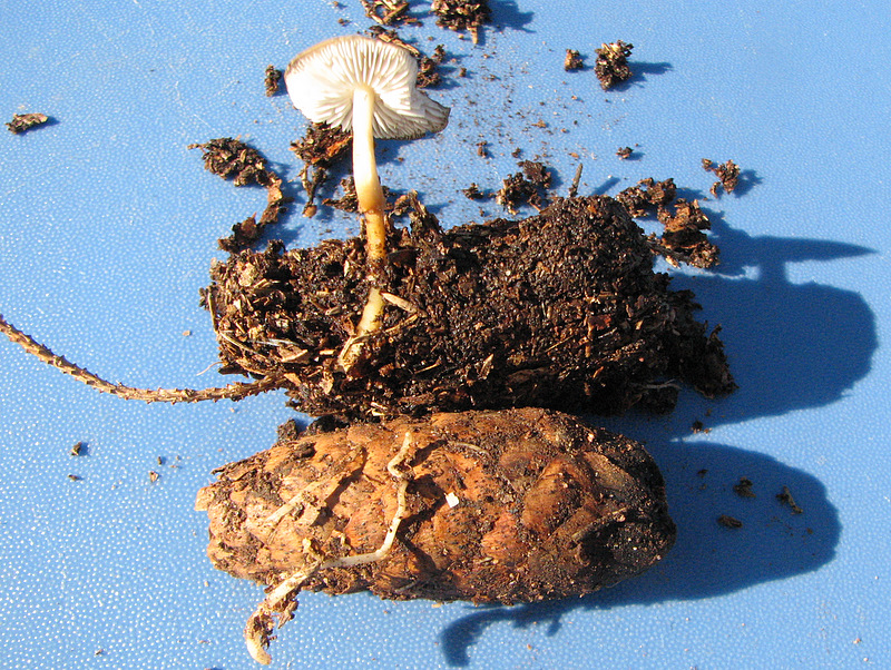 Hallo Forum Ich war heute nochmal auf dem Häckselacker und wurde tatsächlich nochmal fündig. Zwar ein nicht ganz so fotogenes Pilzchen wie erträumt, aber mit ausgebuddeltem Zapfen. Der Zapfen lag etwa 8-10 cm unter der torfähnlichen Schicht. Am Zapfen hängt noch ein zweites Pilzchen, das es aber noch nicht zur Oberfläche geschafft hat.