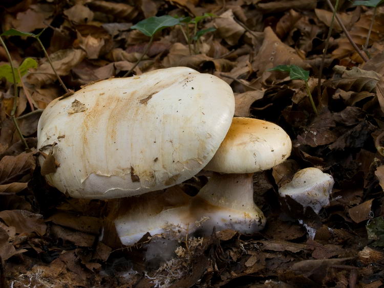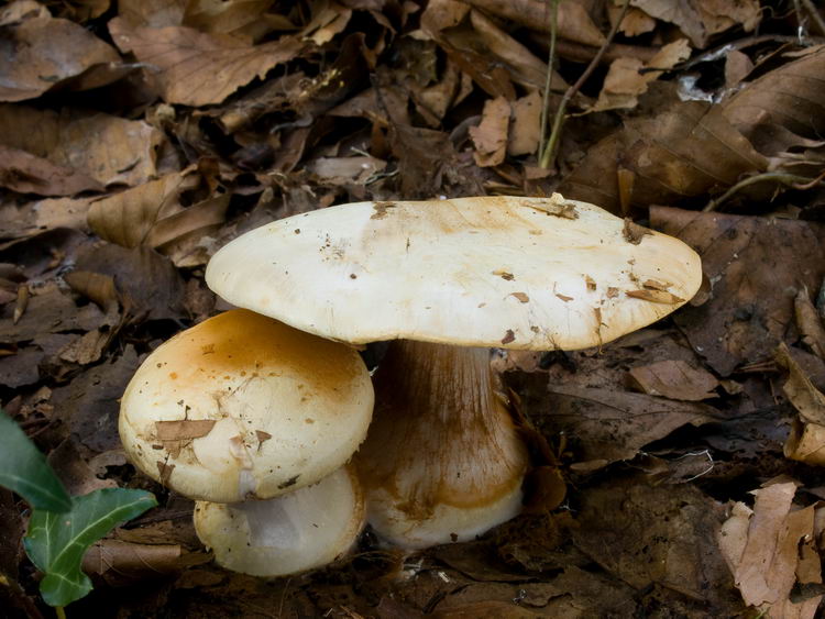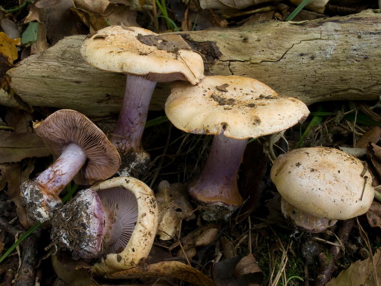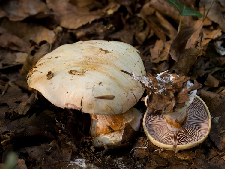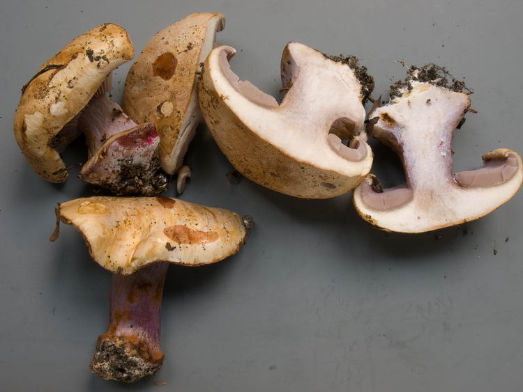 Hallo zusammen, zur Auflockerung der Schneetristesse hier mal zwei Klumpfüße vom vergangenen Herbst. Die erste Kollektion stammt aus einem recht trockenen Mischwald (Linde, Eiche, Kiefer, Kalkboden) in der Schotterebene nördlich von München. Mit dem Schlüssel in der Funga Nordica bin ich bei Cortinarius insignibulbus Bidaud & Moenne-Locc. gelandet. Leider habe ich keine Vergleichsfotos gefunden. Mykorrhiza-Partner dürfte Linde, evtl. Eiche gewesen sein. KOH am der Knolle pink, am Hut braun bis rotbraun, am Huffleisch +/- negativ, Sporen 10,9 x 6,3. Wuchs vergesellschaftet mit C. saporatus.