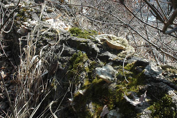 Am 17. März 2010 kehrte ich an den Fundort zurück um Aufnahmen der noch frischen Baumpilze zu machen. Der Fundort ist eine buschreiche Sandsteinkuppe in steiler Südhanglage. Bild 2 zeigt den gefällten Baumstamm mit einigen Baumpilzen.
