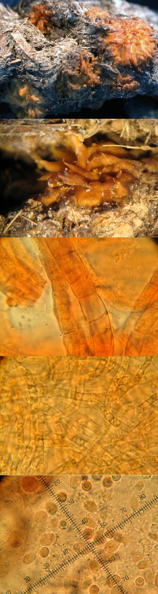 heute gab es am Rande eines Waldweges auf einem Dungknödel, der hauptsächlich aus Gräsern bestand, einen orangeroten Überzug mit Falten und stachelförmigen Auswüchsen. Auf den ersten Blick hat er mir eine Phlebia radiata vorgetäuscht, die sich auf das falsche Substrat verirrt hat.