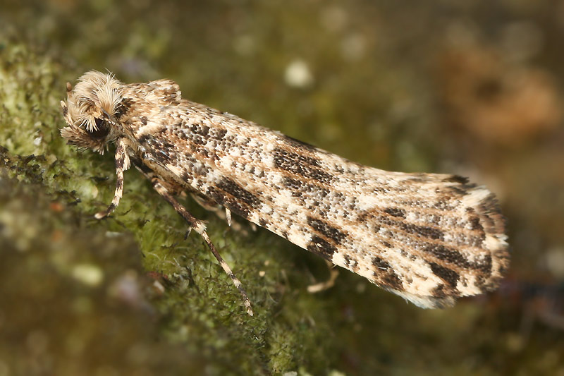 Daraus ist heute dieser Kleinschmetterling geschlüpft: Morophaga choragella, Männchen, aus der Familie der Tineidae.
