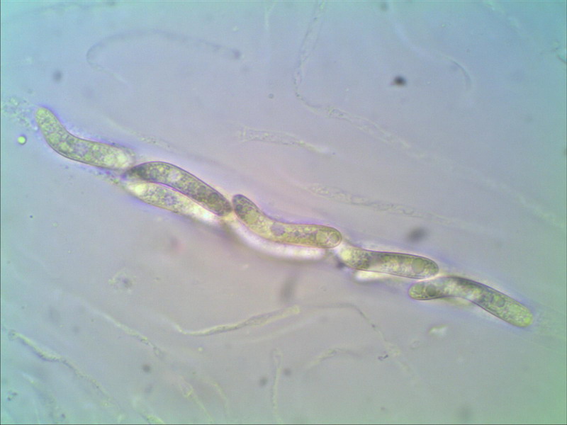 Bei den Pyrenomyceten auf Bild 01 habe ich keine Sporen finden können, vielleicht waren die Pilze schon zu alt. Bild 03 mit den weißen Kappen allerdings wurde ich fündig, und ich denke, es handelt sich um Lasiosphaeria spermoides. Die Sporengröße ist 24 x 4 (über Pole gemessen). Vorallem Rosellinia thelena sind makroskopisch ähnlich aus, über diese Sporen hätte ich mich mindestens genauso gefreut. Der Pilz soll ja selten sein, so steht es zumindest in PdS.