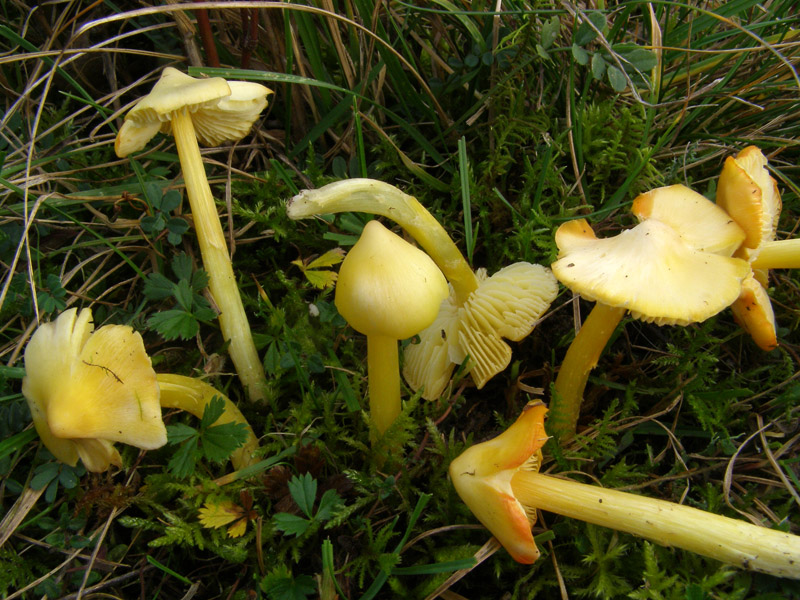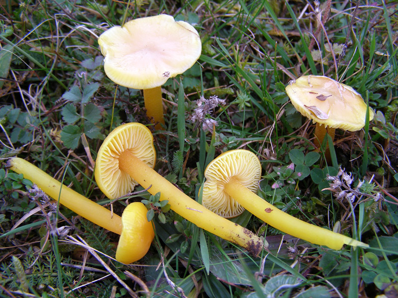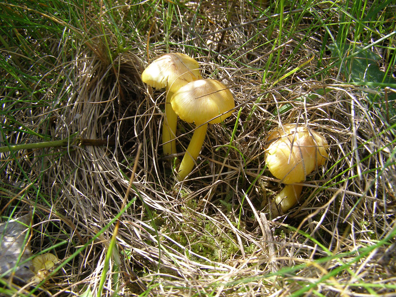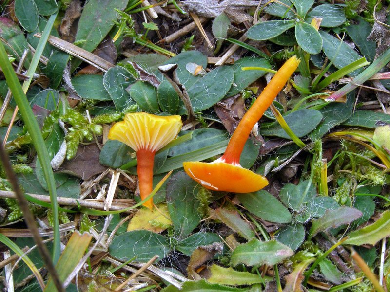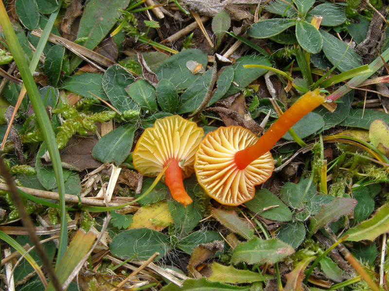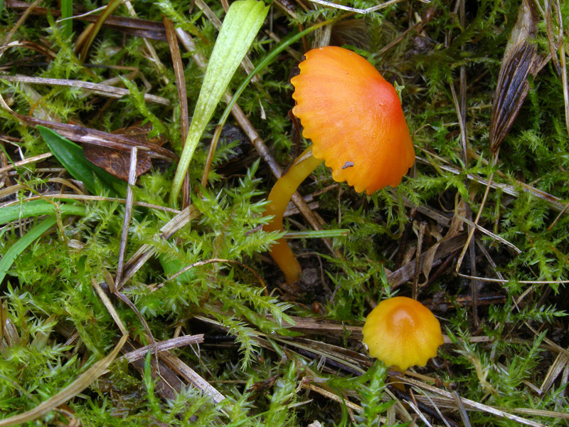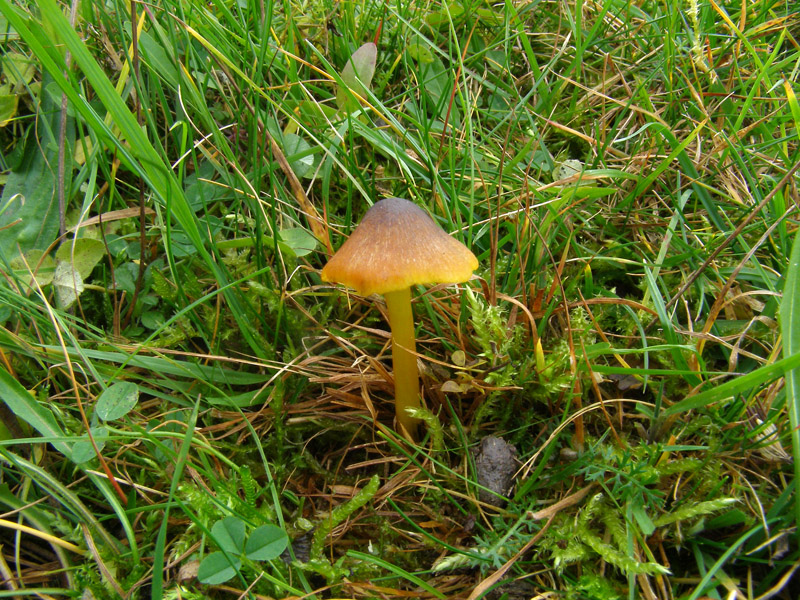 Dieses ist meines Erachtens der Stumpfe Saftling, Hygrocybe chlorophana. Auf einem Silikatmagerrasen.