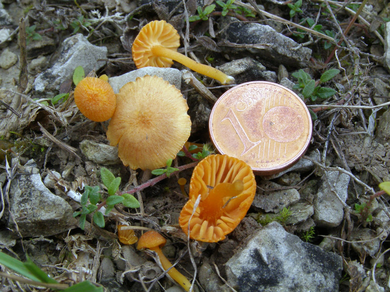 Mit allergrößter Vorsicht denke ich hier in Richtung Feuerschuppiger Saftling, Hygrocybe intermedia. Aus einem Trockengebüsch. Der Stiel graut beim Trocknen.