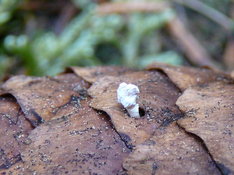 Unbekanntes pilzähnliches Objekt auf einen Fichtenzapfen, was könnte das sein? Ein Schleimpilz?