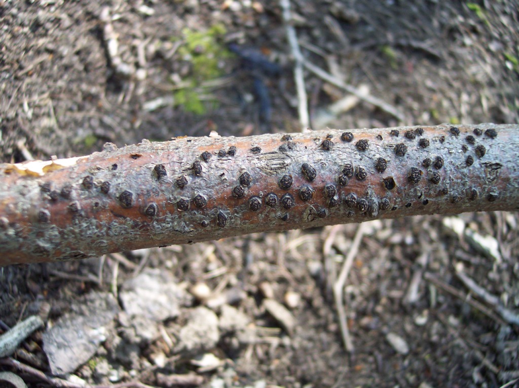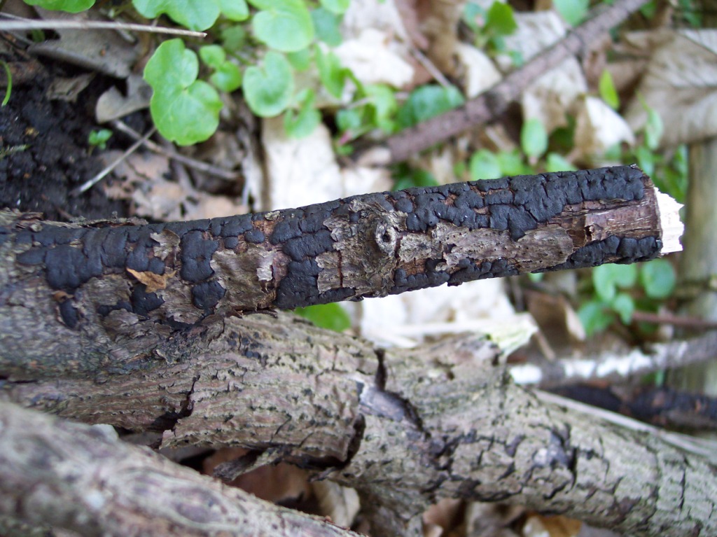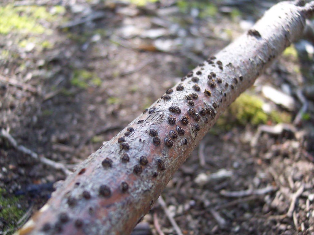 Hallo zusammen! Ich habe hier noch ein paar unbestimmte Funde. Diesmal etwas weniger. ;-) Zuerst ein Eckenscheibchen, nehme ich an. Der Ast ist eventuell von Erle. Daneben standen kleinere Bäume, die eine sehr ähnliche Rinde besaßen. Sie hatten diese Kätzchen und ovale Blätter, die allerdings gezackt waren. Anscheinend kann der Rand unterschiedlich ausgebildet sein (vgl. http://commons.wikimedia.org/wiki/File:Alnus_glutinosa_001.jpg und http://commons.wikimedia.org/wiki/File:Alnus_glutinosa_Bialowieza_001.jpg). Ich vermute daher, dass es sich hier um Diatrypella verruciformis handelt.