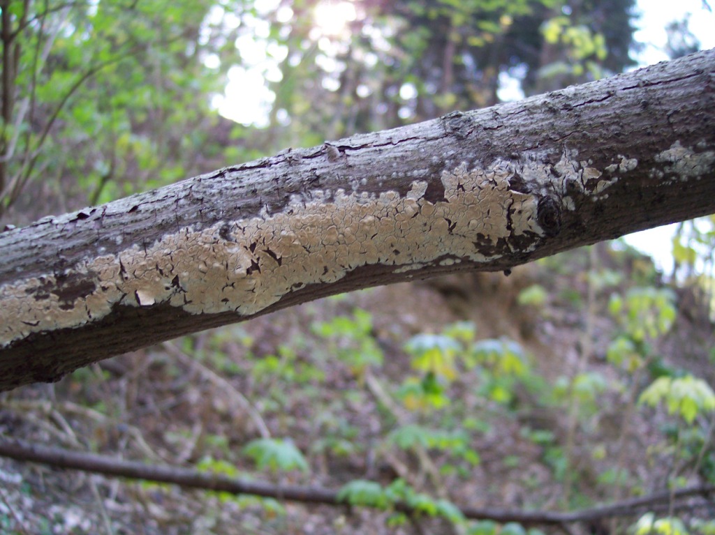 Der hier scheint etwas älter zu sein. Der Fleischfarbene Borstenrindenpilz (Peniophora incarnata) ist es wohl nicht. Er hatte eine Konsistenz wie noch nicht ganz trockene Farbe, die bereits abblättert.