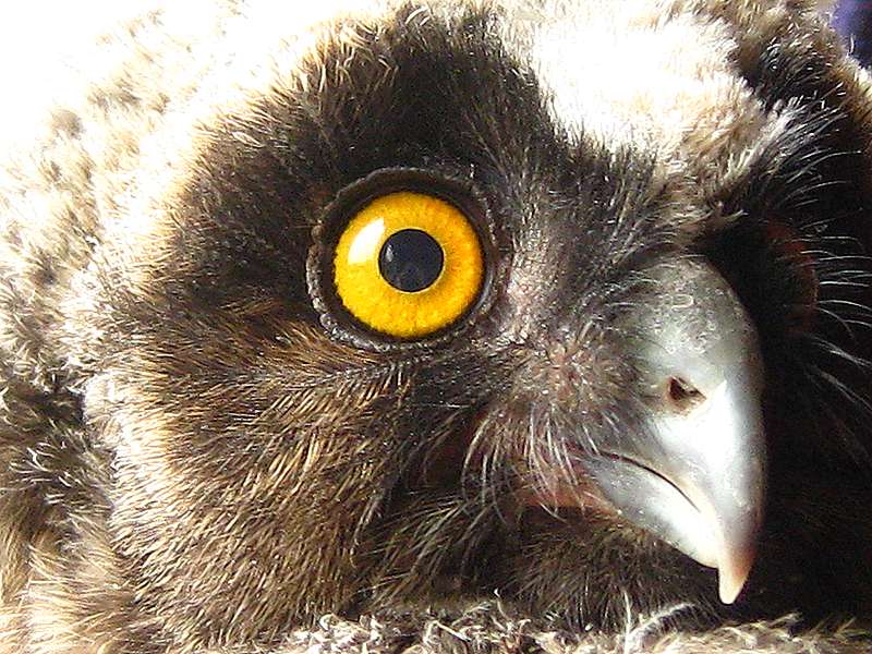 Ja, wer von euch hat schon in das Auge einer Waldohreule geschaut? Jetzt könnt ihr es. Sieht nicht aus wie von einem Baby, aber es ist noch ein beduntes Eulenkind.