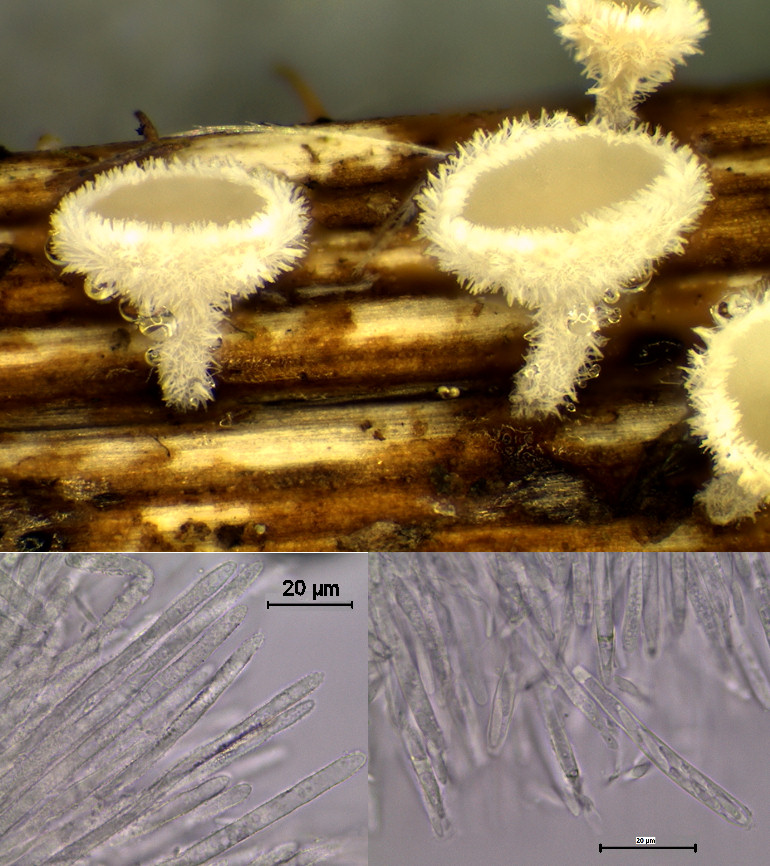 Hallo zusammen, bei der Suche nach Phytoparasiten fiel mir gestern bei Aschau i. Chiemgau neben einem Graben auf einem vorjährigen, runden grasartigen Stängel ohne Knoten diese Pilzchen auf. Unter der Annahme, dass es sich um eine Binse handelt, fand ich dabei irgendwo im Net ein Binsen-Haarbecherchen, Lachnum apalum. Zwar sind die Saprobionten nicht mein Betätigungsfeld, aber wenn schon mal da, interessiert mich auch die Art. Könnte sie richtig sein? Gibt es evtl. einen Schlüssel für die Gattung oder Familie? Details: Becherdurchmesser bis 1,1 mm; Sporen 9,7-10,1 x 1,95-2,1 µm, am Ende mit einem kleinem Fortsatz; Paraphysen an der Oberfläche granuliert. Danke für Eure Hilfe im voraus und viele Grüße