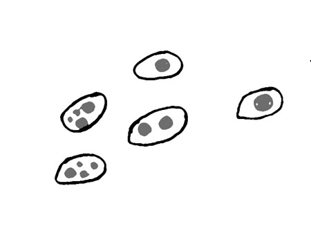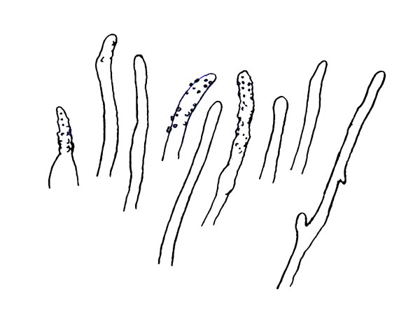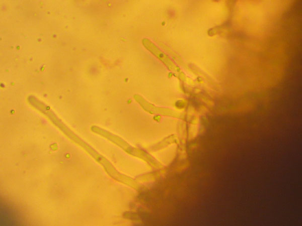 die wenigen gefundenen Basidien waren 4-sporig Im Querschnitt ragten diese meist +- zylindrischen Hyphen-Enden heraus: