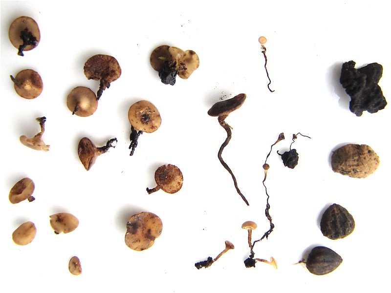 Hallo Ingo, Iris und Ueli Was lange währt... endlich kam ich dazu, meinen kleinen Asco nochmals genauer anzuschauen und div. Literatur zu studieren. Ihr habt alle Recht. Es handelt sich um Sclerotinia sclerotiorum, die sich auf den faulenden Wurzeln und Stengeln der Petersilie wohl fühlte. Ich siebte die ganze Erde und die Pilze im feinmaschigen Sieb durch. So sieht das nun aus. Rechts aussen von unten nach oben vermutlich 2 Samen, unbekannter Herkunft. Dann ein Lehmkügelchen und oben etwas, was ich zuerst für ein Sklerotium hielt, es aber wieder verwarf. Die Sklerotien scheinen an den kleinen Fruchtkörpern zu hängen. Danke für eure Hilfe Ligrü