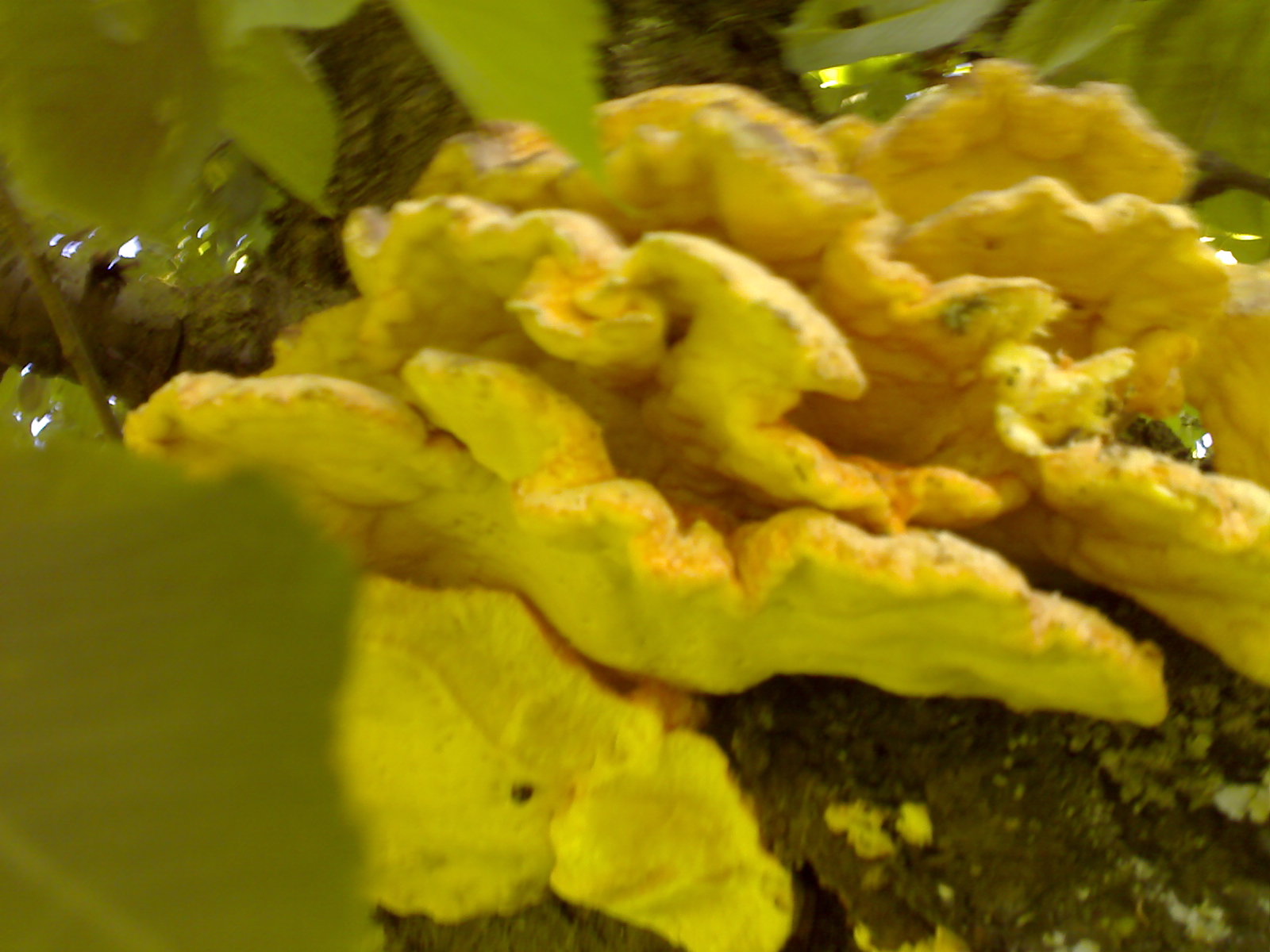 hab heut beim mountain biken einen riesigen schwefelporling an einem kirschbaum in 3 meter hoehe entdeckt.er wiegt ungefaehr 5 kg. der fund kam genau zur richtigen zeit, da ich dieses jahr noch nichts gefunden hatte und der frust sich langsam anstaute :) fundort: an der werra landesgrenze hessen/thueringen geschmacklich erinnert er tatsaechlich stark an huehnchen :)