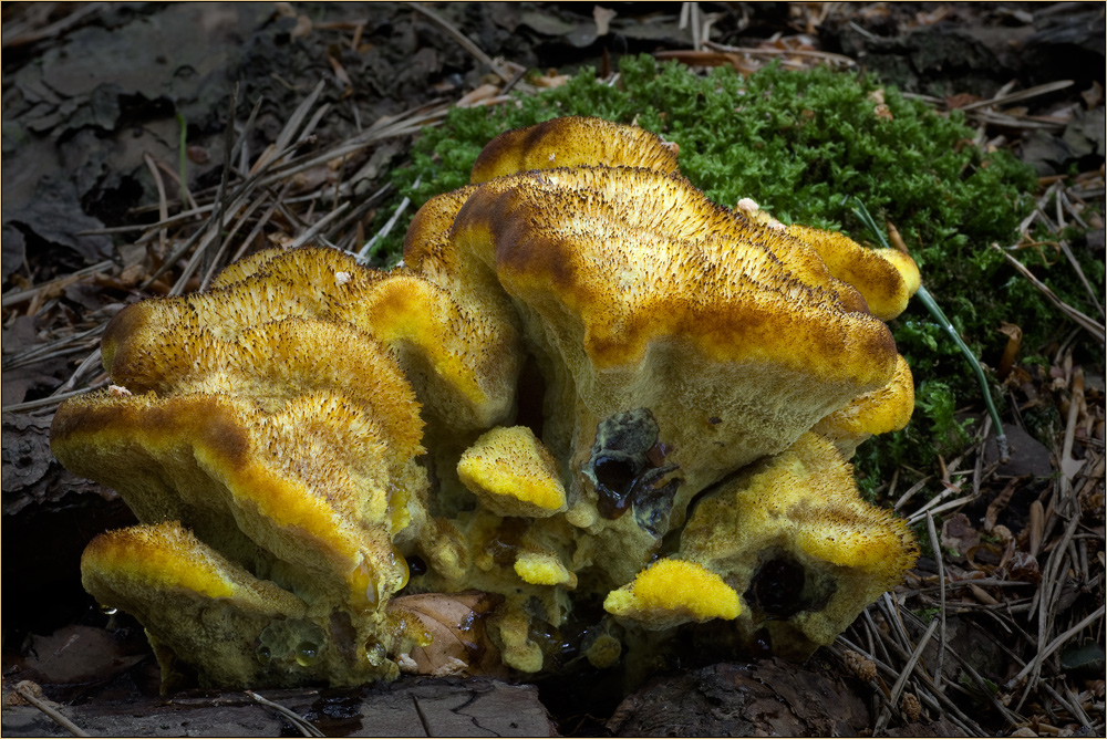 Der gesamte Pilz hatte einen Durchmesser von ca. 15 cm und sehr weich. Die Konsistenz ähnelte eingeweichtem Bisquitboden. Für mich ein Erstfund. Könnte das Phaeolus schweinitzii sein? Viele Grüße Uli