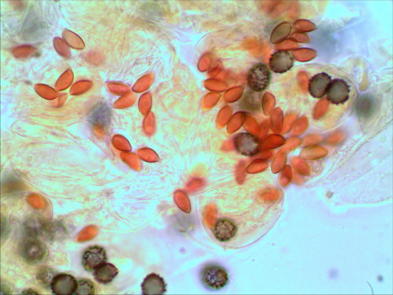 Gestern hatte ich aus interesse ein Quetschpräparat von Russula romelii in Menlzer gemacht und fand diese rötlichen Sporen darin. Hat jemand eine Idee, was das sein könnte?