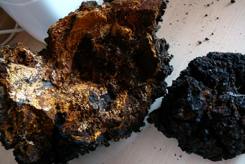 : LG, : olly Hallo Olly Irgendwas Geheimnisvolles ist an der Tschaga schon dran. Ich begann mich mit diesen Pilzen zu beschäftigen, als ein Familienmitglied an Krebs erkrankte. Da habe ich den Pilz gezielt gesucht, verarbeitet und dieser wurde dann begleitend zusich genommen. Ob der Glaube an diese Kraft das Alleinige ist, mag ich nicht beurteilen, jedenfalls zeigten sichpositive Ergebnisse. Zum Pilz: Es ist sehr schwer, diesen zu ernten. Meist sitzt er mehrere Meter oben an den Birken. Man bekommt ihn nur mit einer Axt oder Säge ab, und zwar so, daß man die Borke nicht beschädigt. Bedenkt man, daß der Porling der Birke nur schadet, kann man eigentlich kein schlechtes Gewissen haben. Die Zubereitung muß noch am gleichen Tage geschehen, sonst wird der Pilz steinhart. Man muß mit einen stabilen Messer oder Gegenstand die innere braune, meist gelb geaderte Konsistenz in Stückchen rauspulen. Das ist sehr mühsam und macht viel Dreck. Danach werden die Brocken getrocknet.