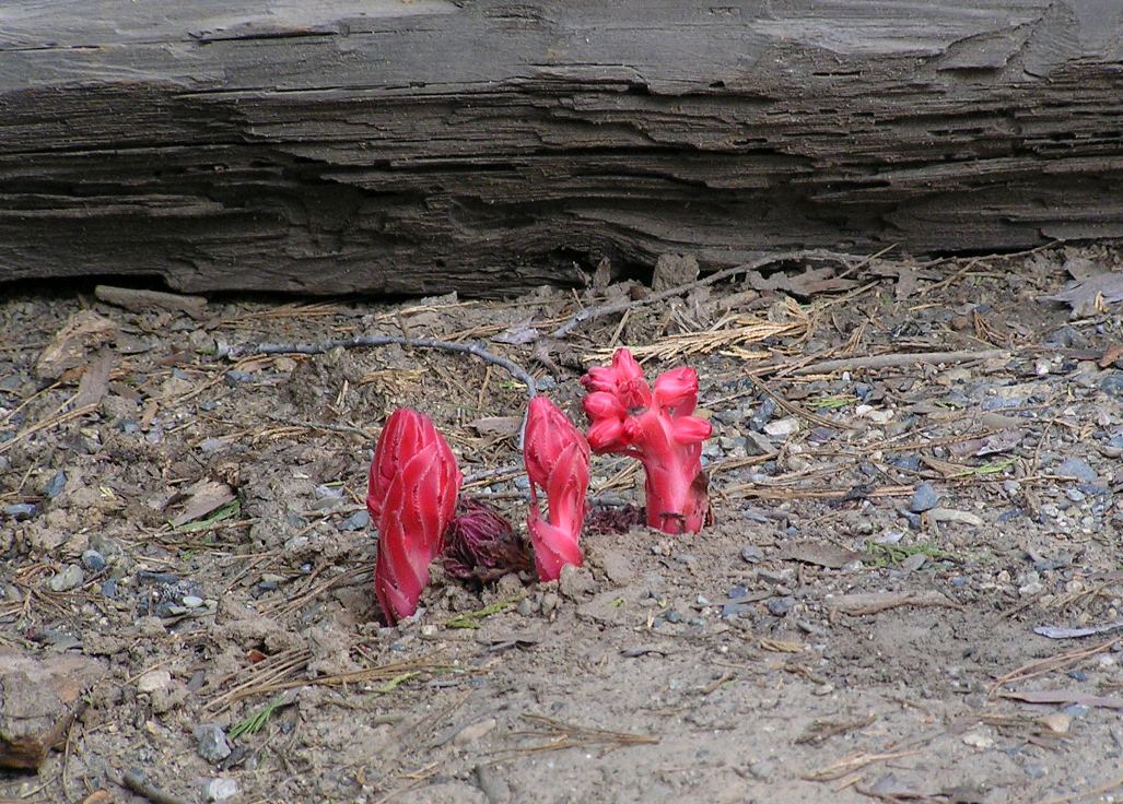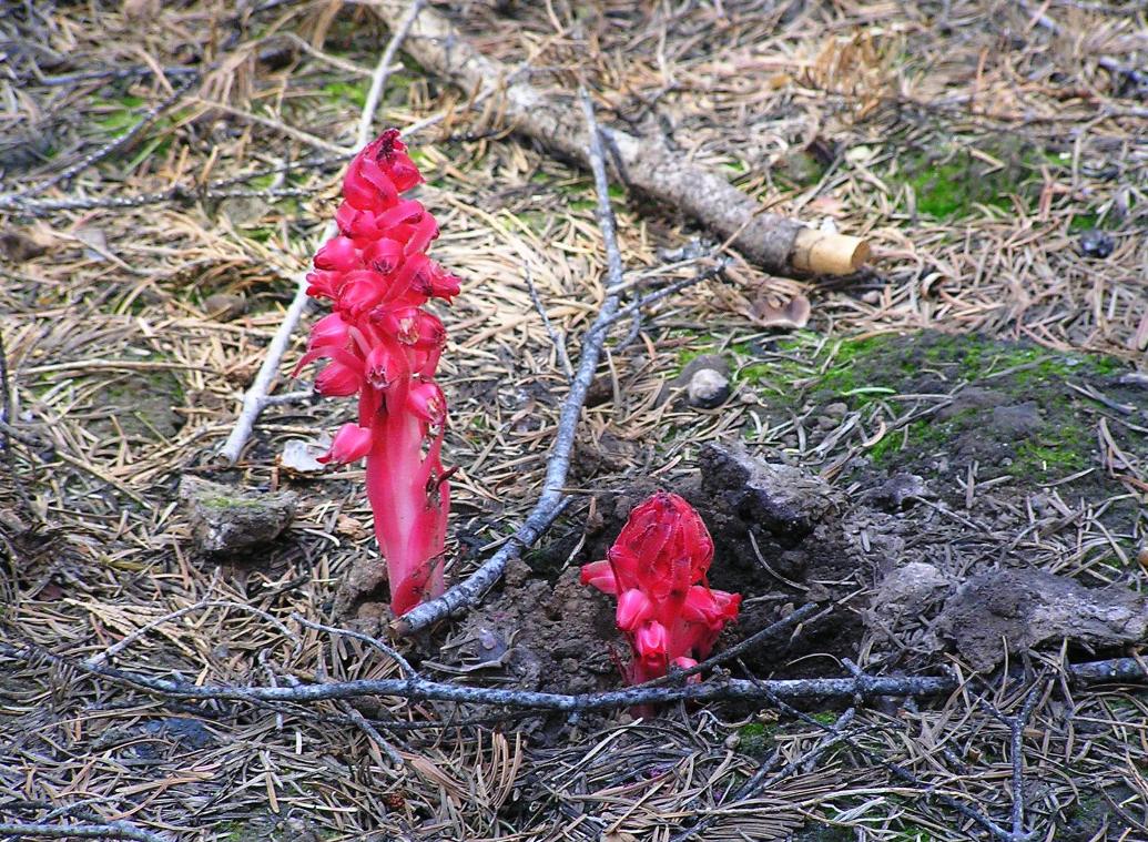 Die Snow Plant / Sarcodes sanguinea ist eine mykotrophe Pflanze, wie unser Fichtenspargel, die Ihre Nährstoffe aus der Fotosynthese von Koniferen bezieht, über ein Pilzmyzel als Vermittler.