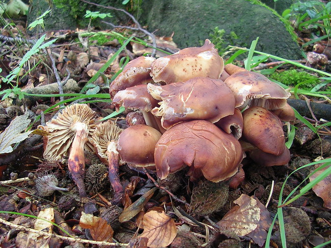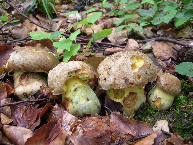 die Röhrlinge im Stiel leicht rosa verfärbend, Hut und Röhren blauend
