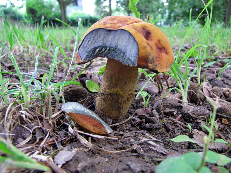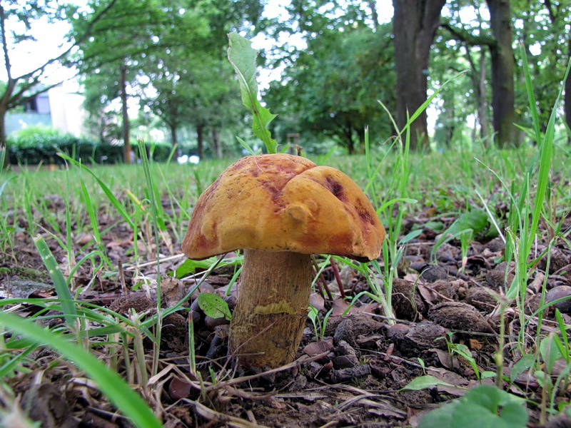 Bei ein paar eher verteilt stehenden Einzel-Exemplaren bin ich wieder vorsichtiger, mit wunderbar orange-leuchtendem Hut, rot gesprenkelt, der Stiel nicht so wirklich glatt - bleibt da was anderes als B. queletii?