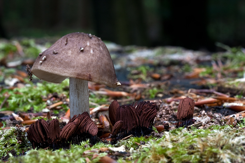 Pluteus cervinus auf einem alten Buchenstubben, umzingelt von Schleimpilzen.