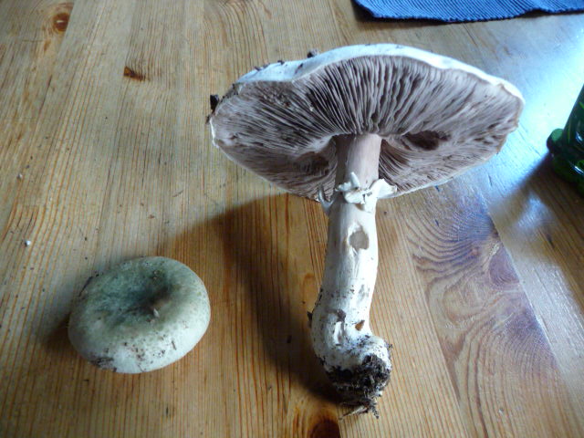 Hallo, auf dem Bild sollte ein Anischampignon (hat sehr deutlichen Anisgeruch), weiterhin ist der Kopf eines Grüngefelderten Täublings zu sehen. Gruß Detlef