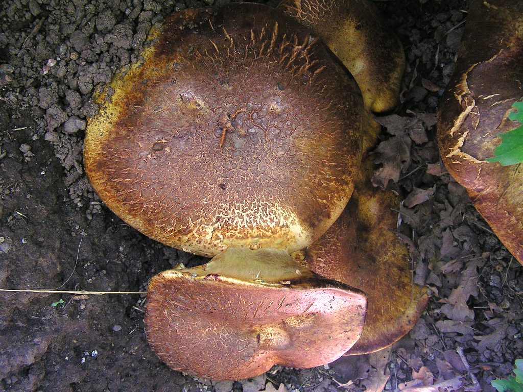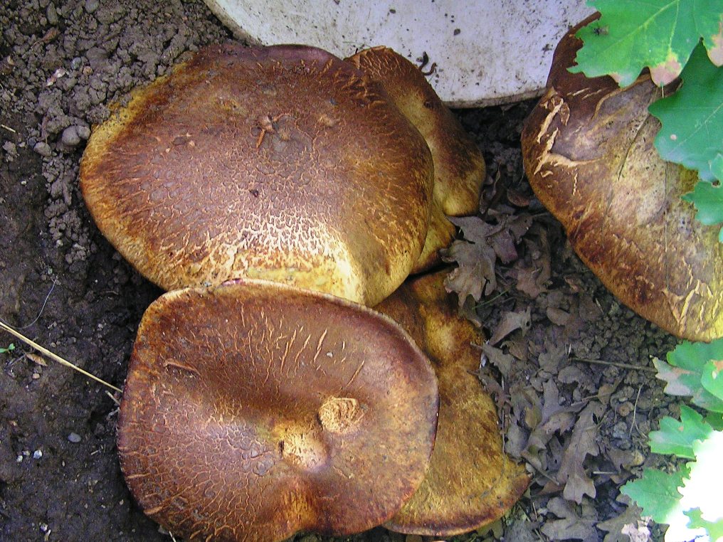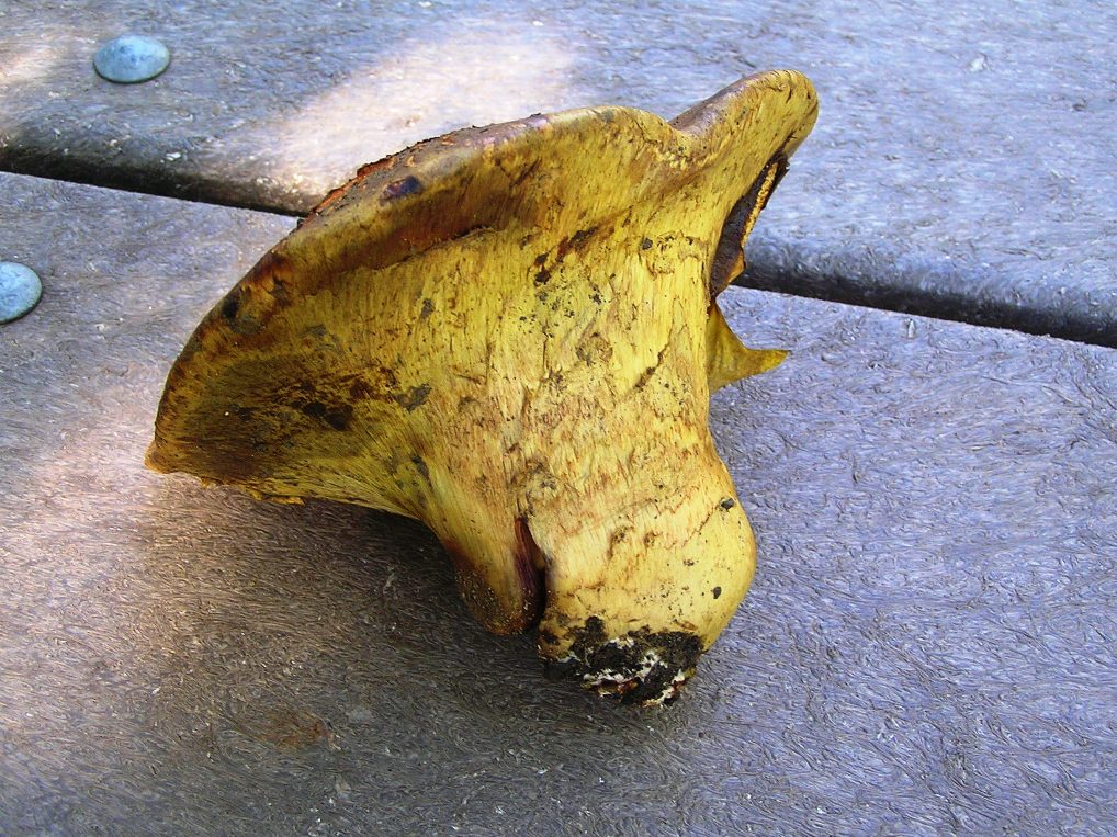 Der Hutdurchmesser ist 15 bis 20cm, ich könnte mir aber vorstellen, dass sie an dieser exponierten Stelle größer als normal werden. Die Huthaut ist trocken, mittelbraun auf gelbem Grund.