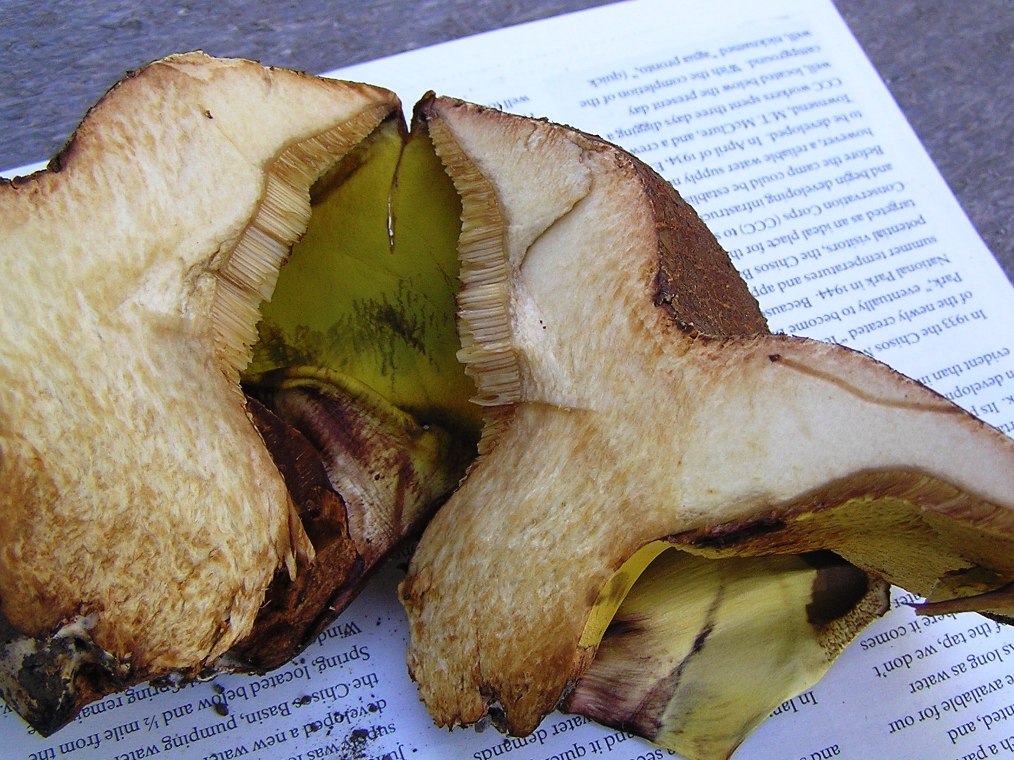 Alle Teile bräunen nach Berührung. Fleisch im Schnitt hell, fängt gleich an zu bräunen, allerdings nicht so intensiv wie die Poren.