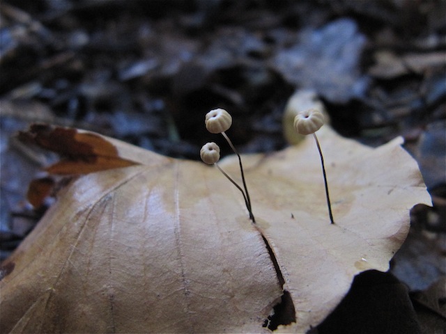 Hallo zusammen Diese drei strammen Bürschchen fand ich heute auf einem Buchenblatt. Gesamthöhe ca. 14mm. Hutdurchmesser 2mm. Die Hutoberseite ist braun genabelt. Auf der Unterseite sind 11 entfernt stehende Lamellen mit Kollar.