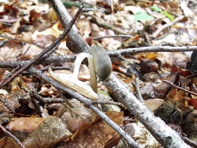 Hallo Karl- Heinz Nach dem Bild in dem Link war ich zuerst nicht hundertprozentig sicher, ob das der Pilz ist. Ich habe dann mir die Pilze noch mal am nächsten Tag nach der Arbeit angesehen. Dieser riesige und gerade Stiel, wo sich noch ein großer Teil im Laub verbirgt, ist wohl das beste Kennzeichen. Danke für die exakte Pilzbestimmung und nicht böse sein, daß ich heute erst antworte. Ich schiebe immer einzelne Sachen auf Sonnabend früh. Muß auch noch einiges anderes beantworten und erledigen. Noch ein Bild von so einem Langstieligen Rübling und einer Schnecke, die den Pilz gerade gefällt hat. VG