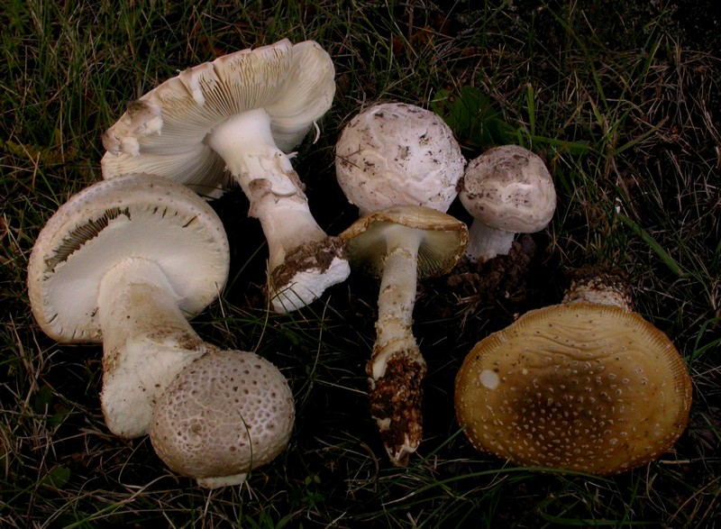 Neben der schon gezeigten Amanita echinocephala/ Igelwulstling (links) auch noch der Fransige Wulstling/ A. strobiliformis (oben) und der Eingesenkte, Kammrandige oder Isabellfarbene Wulstling/ A. eliae rechts: