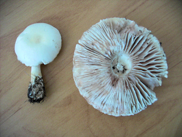 Beim Schwiegervater wachsen meiner Meinung nach auf seiner Gartenwiese der Weiße Anischampignon. Also weißer Hut, weiße Lamellen und beim älteren ein etwas glblicher Fleck auf dem Hut und leicht gerötetet Lamellen. Knolle leicht angedickt. Geruch angenehm nach Pilze (also nicht Anis direkt).