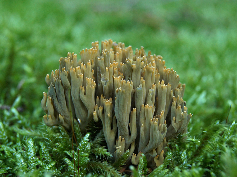 Hallo zusammen, neben der in manchen meiner Wälder massenhaft vorkommenden R. stricta (und den noch aufdringlicheren Clavulinas) habe ich gestern im moosig-grasigen Fichtenwald endlich mal eine andere Koralle gefunden. Die FK wuchsen aus der Fichtenstreu unterhalb der Moospolster, die meisten waren mehr ocker als grün, Strunk weiß und mit Fichtennadeln verwachsen.