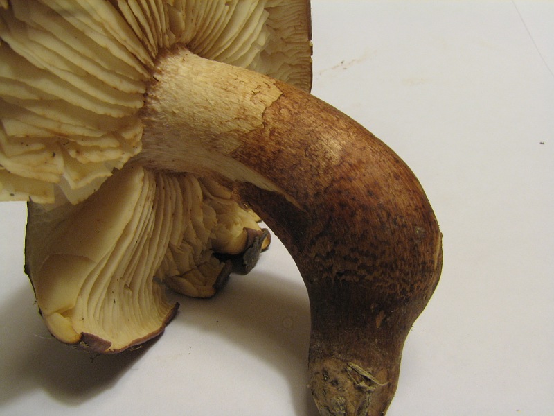 Ich kann natürlich nicht ausschließen, dass ich da irgendwas Kieferiges im weiteren Umfeld übersehen habe... aber direkt unter der Eiche war da nix Vergleichbares. *noch mehr grübls* Angehängt mal ein Küchentisch-Foto von Stiel und Lamellen. Die Unterlage ist weiss, der gelbliche Farbton kommt schon halbwegs hin.