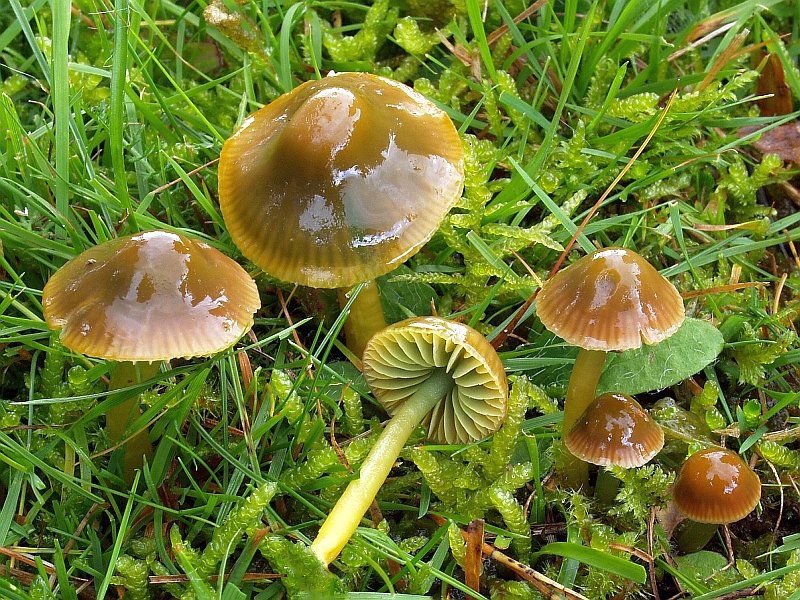 winzigsten, taufrischen Fruchtkörpern treten nie Grüntöne am Hut auf. Auch