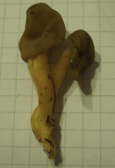 Diese beiden kleinen Pilze habe ich heute im Mischwald (hauptsächlich Kiefer und Buche) gefunden. Von den Begleitpilzen zu urteilen (Herbsttompete, Semmelstoppel) düfte der Boden eher basisch sein. Stiel ist etwa 4-5 cm lang, 4-5 mm dick und dottergelb. Der Hut ist etwa daumennagelgroß und lappig-faltig, ähnlich einer Lorchel. Die Farbe würde ich als olivgrau beschreiben. Hat jemand eine Idee?