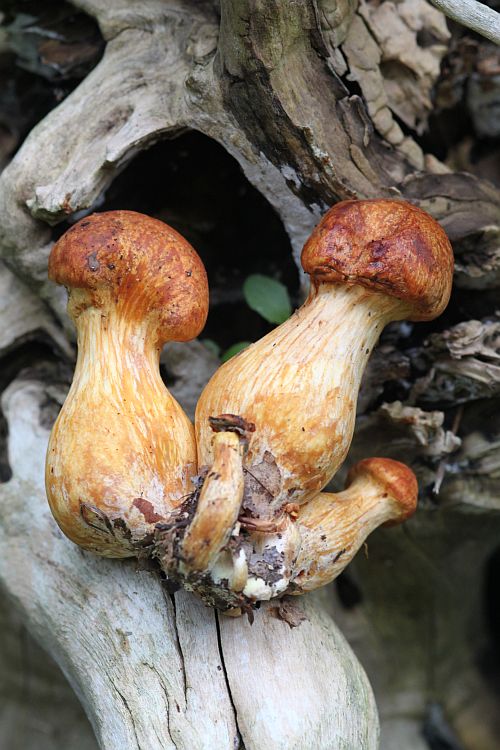 Moin zusammen, gestern schickte mich eine Spaziergängerin zu einem Baumstumpf (vermutlich Buche) mit den Worten, die sähen so lecker aus, die können gar nicht giftig sein (seufz). Bildschön waren sie die leuchtend orangenen Fruchtkörper. Das Bild war aber zerstört, weil ein paar Vandalen alles mehr oder weniger platt gemacht hatten. Warum tun Menschen so etwas? Fundort: Südliches Schleswig Holstein, die Pilze riechen scharf und unangenehm. Meiner unmaßgeblichen Meinung nach kommt Gymnopilus spectabilis in Frage. Kann das bitte jemand bestätigen oder dementieren? Liebe Grüße Kirsten Eta