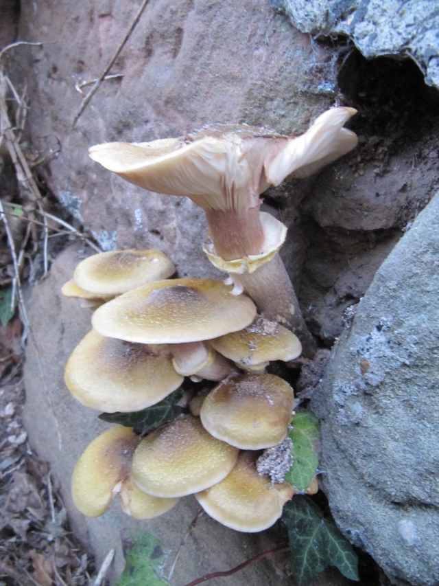 Hier handelt es sich m.E. um einen honiggelben Hallimasch, der offensichtlich aus einer Steinmauer herauswächst. Der Hallimasch nicht nur ein Holz- sondern auch Steinzersetzer? Viele Grüße