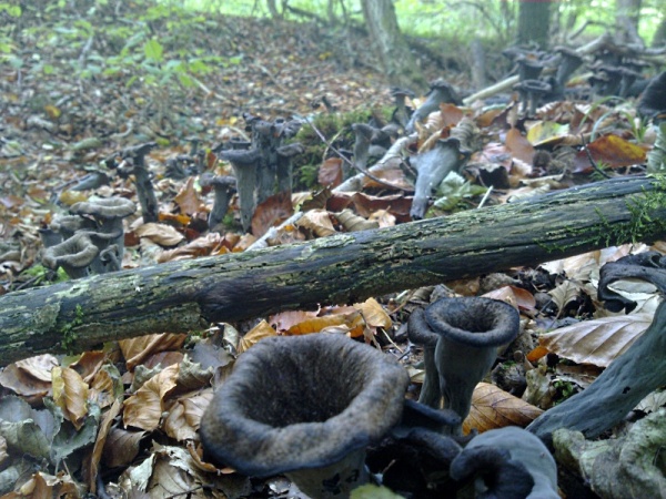 diese aussergewöhnliche Saison klingt hier im Osten Schleswig-Holsteins mit einer regelrechten Herbsttrompetenschwemme aus. Mich würde interessieren, ob auch im Rest des Landes ähnliches zu beobachten ist. Die meisten Exemplare sind mittlerweile schon überständig, aber immer noch besser in Schuß als jene die letzten Freitag auf dem hamburger Isemarkt feilgeboten wurden. Laut Preisschild stammten sie aus Frankreich(!) und sollten 30€ das Kilo kosten.Das war aber gar nichts gegen die Krausen Glucken direkt daneben, das Elend war für sage und schreibe 60€ zu haben. Und es muss wohl tatsächlich Bekloppte geben, die solche Summen hinblättern. Denn ohne Nachfrage kein Angebot.