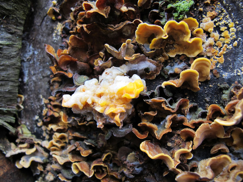 Hallo Pilzfreunde, schon als Tremella mesenterica beschriftet, habe ich auf einen Hinweis von Ursula Sauter hin diesen Zitterling aus dem Wald geholt und näher untersucht.