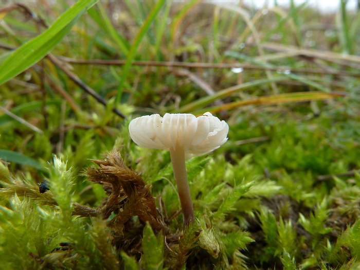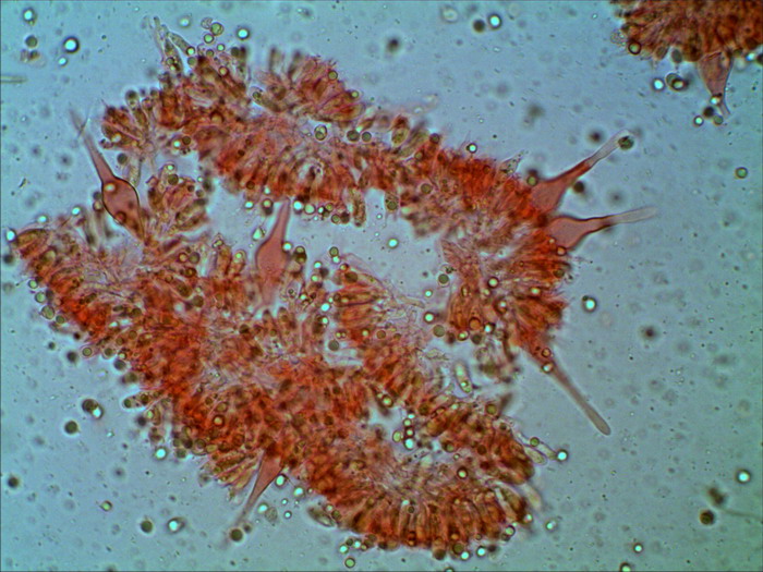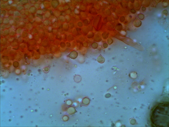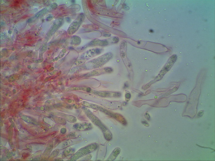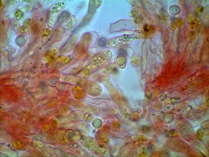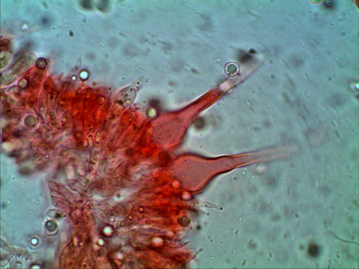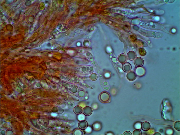 und noch ein unbestimmter helmlingsartiger Pilz mit weiß bereiften Stiel, auffälligen Hymenialzystiden und rundlichen tropfenartigen Sporen. Da bin erst einmal ratlos: