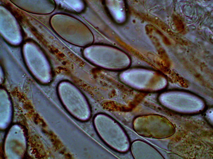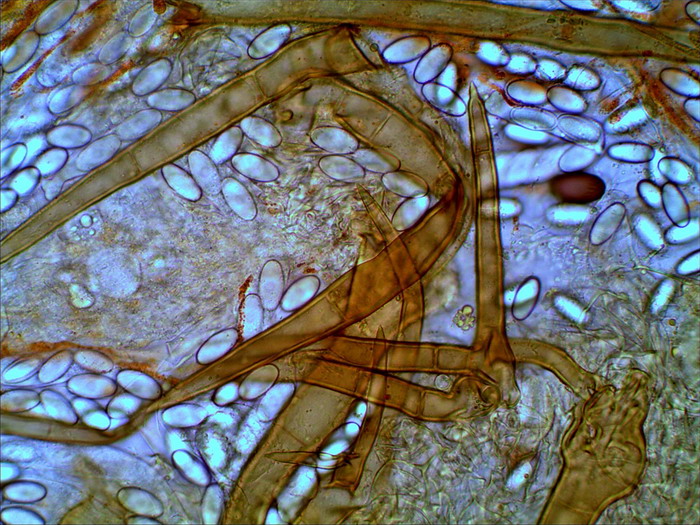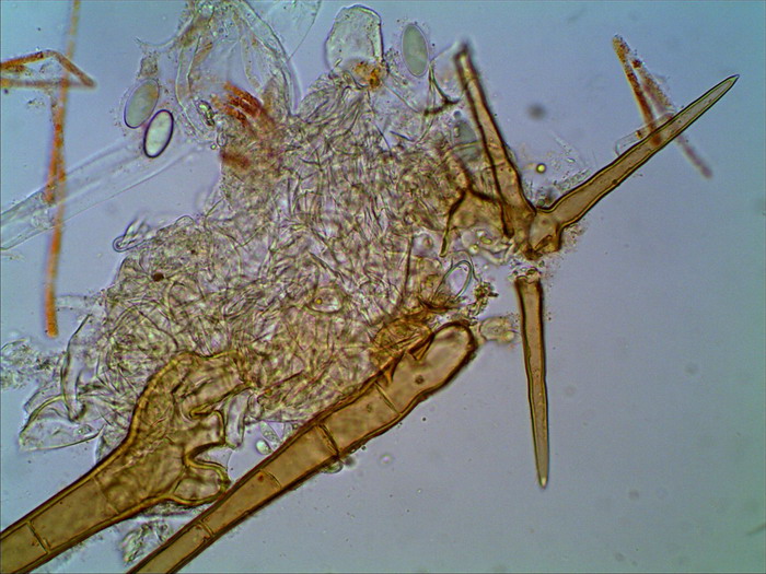 vom gestrigen Kuhfladen. Mit teilweise sternförmigen Randhaaren. Allerdings scheinen die Sporen nicht so recht glatt zu sein und auch die Sporengröße läßt mich an Cheilymenia stercorea zweifeln. Wer weiß Rat? LG Hartmut hier von gestern: