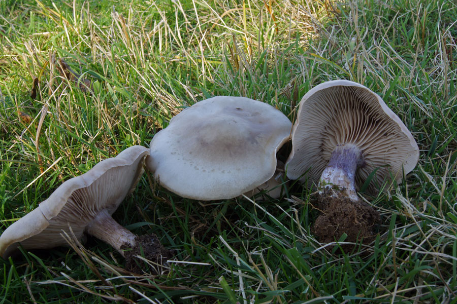 Heute nochmal in den Wiesen in der Nähe, teils mit kleinen Cortinarien, Häublingen und Ellerlingen übersäht, mal was größeres zwischendrin, diese Rötelritterlinge hatte ich zuvor auch nicht gekannt, das müsste Lepista personata sein: