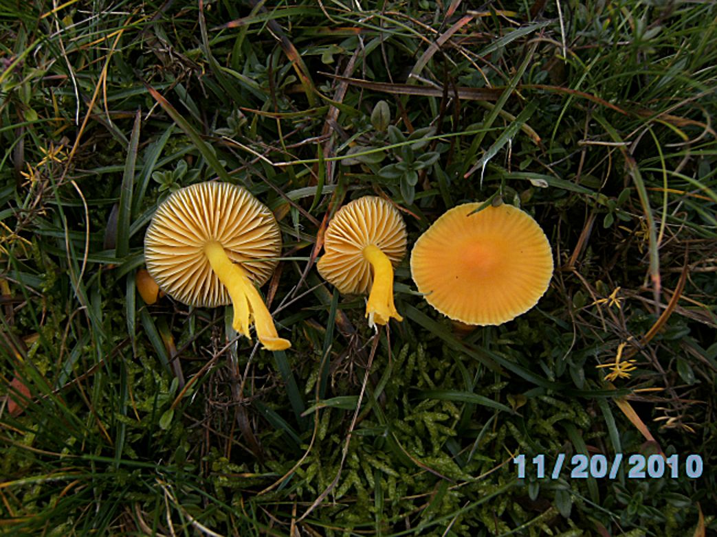 Ein gelber Saftling, relativ schmächtig, mit schlankem Stiel, weder auf dem Hut noch am Stiel schleimig-klebrig. Es kommt Hygrocybe ceracea in Betracht, wird noch mikroskopiert.